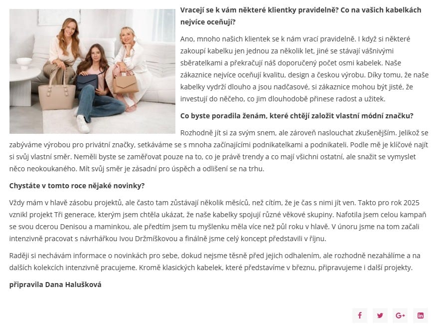 Rozhovor je určen ženám, které hledají kvalitní kožené kabelky české výroby, zajímají se o osobní styl a chtějí porozumět tomu, jak vzniká produkt s dlouhodobou hodnotou – nejen sezónní módní doplněk.