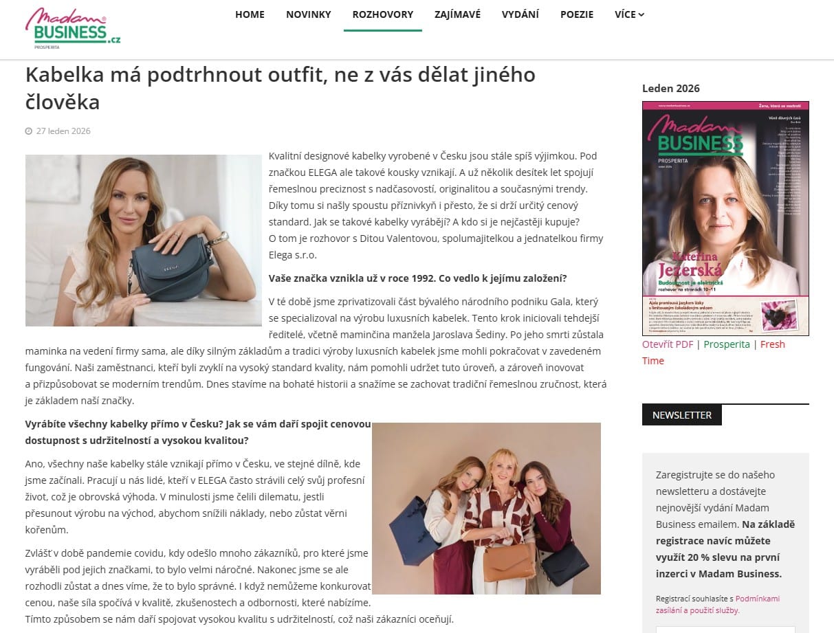 V online magazínu Madam Business i v jeho aktuálním tištěném vydání vyšel rozhovor s Ditou Valentovou, spolumajitelkou a tváří značky ELEGA, která se dlouhodobě věnuje tvorbě českých kožených kabelek pro ženy.